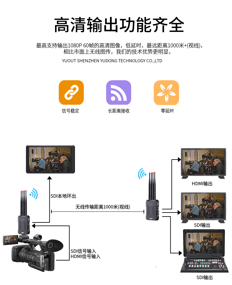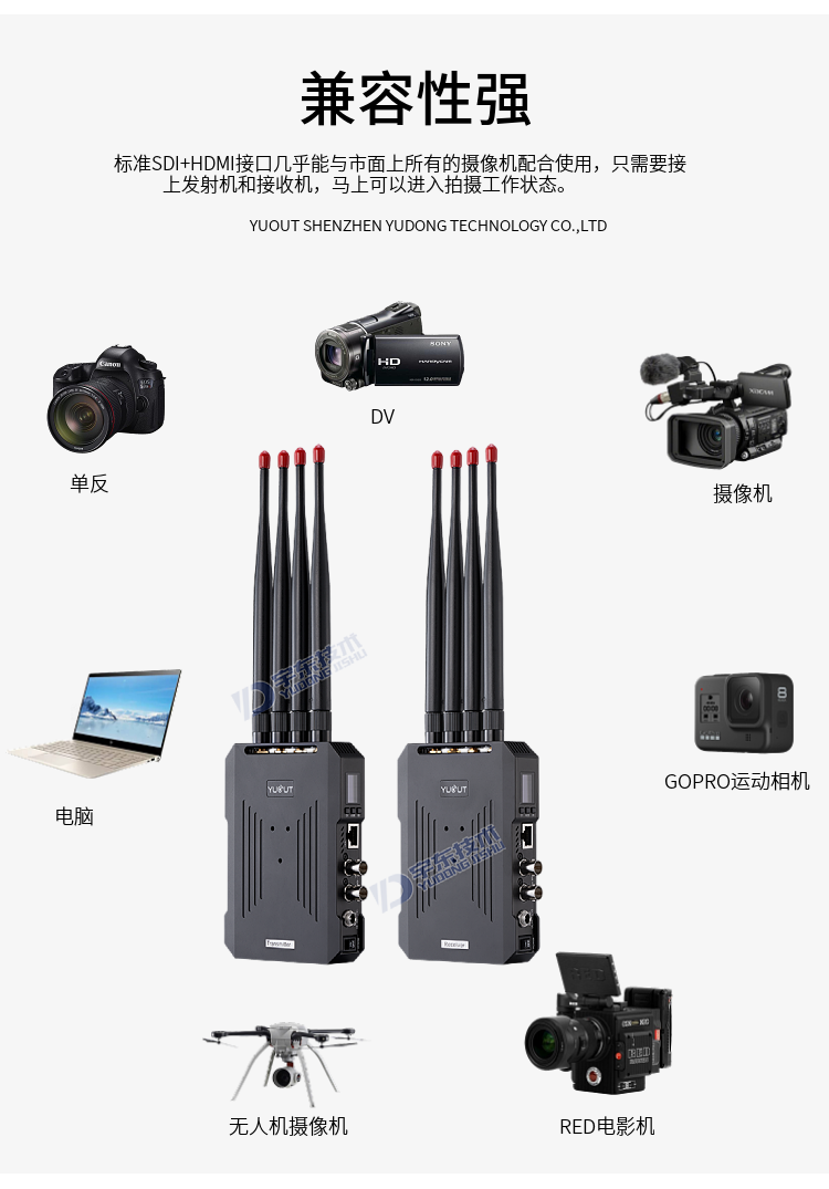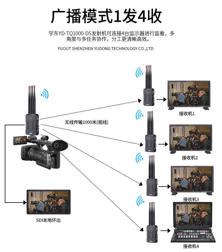 YD-TQ1000-DS是由發(fā)射端和接收端組成,支持3G/HD/SD-SDI或者HDMI 1080P全高清信號傳輸,作為圖傳時,視線無阻擋傳輸距離1000至1500米。頻段采用5.1-5.8GHz,支持用戶手動通信頻點(diǎn)調(diào)整,為發(fā)射端和接收端配對,還支持廣播模式,可以把多個接收端設(shè)置成跟一個發(fā)射端相同的頻點(diǎn),實(shí)現(xiàn)一發(fā)多收。純硬件連接操作,簡單可靠。設(shè)計(jì)精巧,可以F970 、V口、 電源適配器三種供電方式,方便移動拍攝。廣泛應(yīng)用于電影拍攝、應(yīng)急搶險、消防、人防、武警、突發(fā)事故單兵視頻采集等場合;真正實(shí)現(xiàn)高清無線傳輸、移動實(shí)時傳輸.