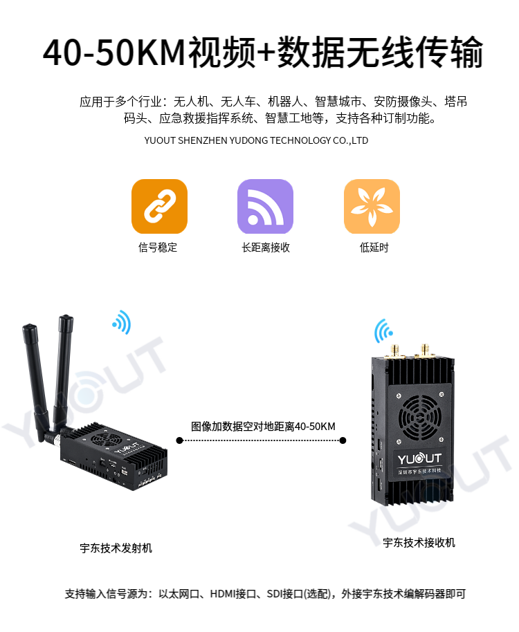 YD-TS0050-WK 是應(yīng)用于無人機(jī)行業(yè)的圖數(shù)控一體化超遠(yuǎn)距離無線傳輸設(shè)備(最遠(yuǎn)可達(dá) 40至50 公里),具有體積小、功耗低、通信距離遠(yuǎn)等特點(diǎn),支持高清視頻、飛控?cái)?shù)據(jù)、云臺(tái)控制數(shù)據(jù)、遙控器控制數(shù)據(jù)等同時(shí)傳輸。