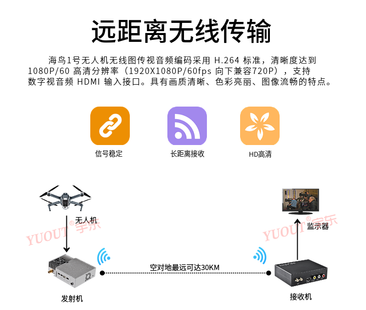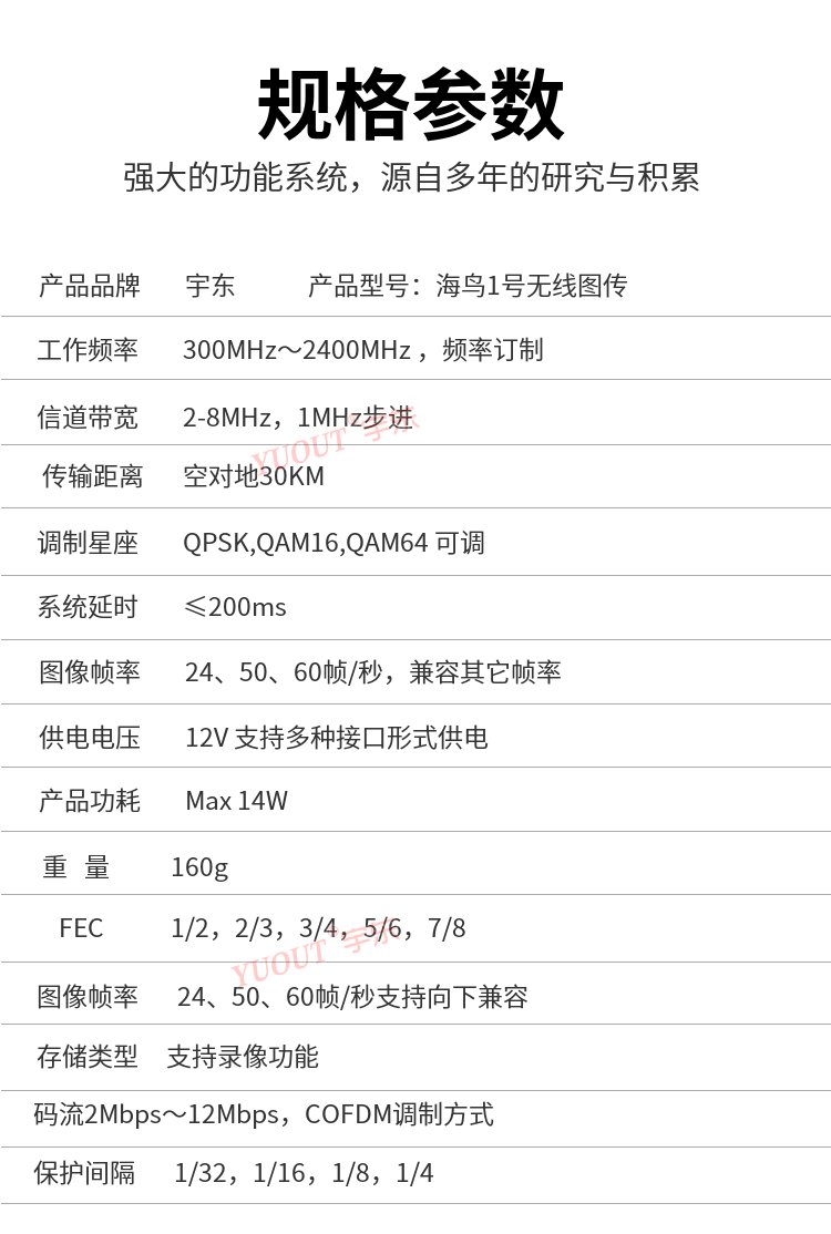 宇東海鳥1號(hào)無線圖傳高清微型無線視頻傳輸系統(tǒng),采用Coded Orthogonal Frequency Division Multiplexing:編碼正交頻分復(fù)用調(diào)制技術(shù),具有傳輸頻帶窄、很強(qiáng)的抗多徑干擾能力和抗多徑衰落能力,能夠?qū)崿F(xiàn)非視距(NLOS),高速運(yùn)動(dòng)情況下實(shí)時(shí)傳輸高質(zhì)量圖像。