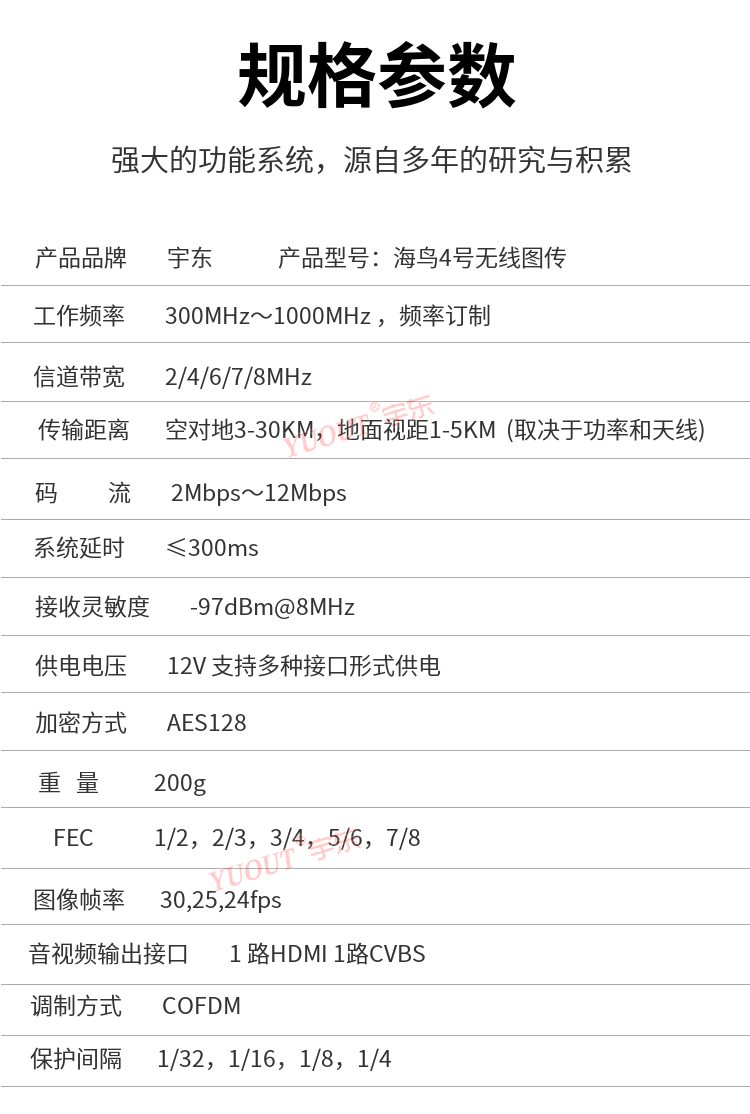 宇東海鳥4號(hào)無線圖傳高清微型無線視頻傳輸系統(tǒng),采用Coded Orthogonal Frequency Division Multiplexing:編碼正交頻分復(fù)用調(diào)制技術(shù),具有傳輸頻帶窄、很強(qiáng)的抗多徑干擾能力和抗多徑衰落能力,能夠?qū)崿F(xiàn)非視距(NLOS),高速運(yùn)動(dòng)情況下實(shí)時(shí)傳輸高質(zhì)量圖像。