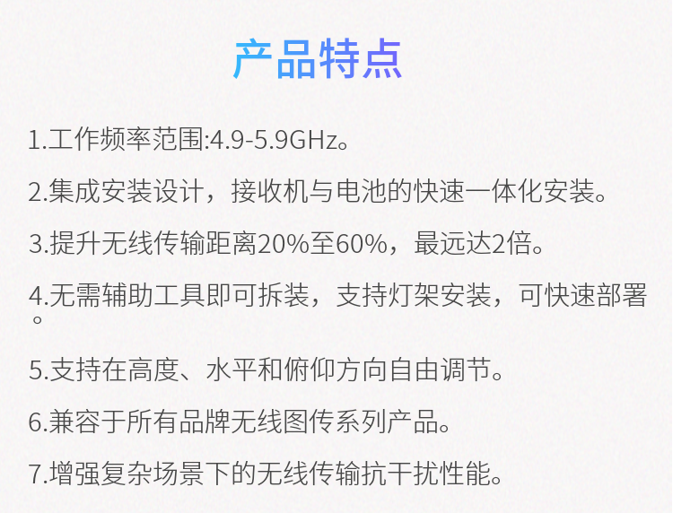 1. 工作頻率范圍:4.9-5.9GHz 2. 集成安裝設(shè)計,實現(xiàn)與接收機(jī)與電池的快速一體化安裝 3. 無需輔助工具即可拆裝,支持燈架安裝,可快速部署 4. 支持在高度、水平和俯仰方向自由調(diào)節(jié), 5. 適用于所有品牌無線圖傳全系列產(chǎn)品 6. 增強(qiáng)復(fù)雜場景下的無線傳輸抗干擾性能 7. 提升無線傳輸距離最遠(yuǎn)達(dá)2倍